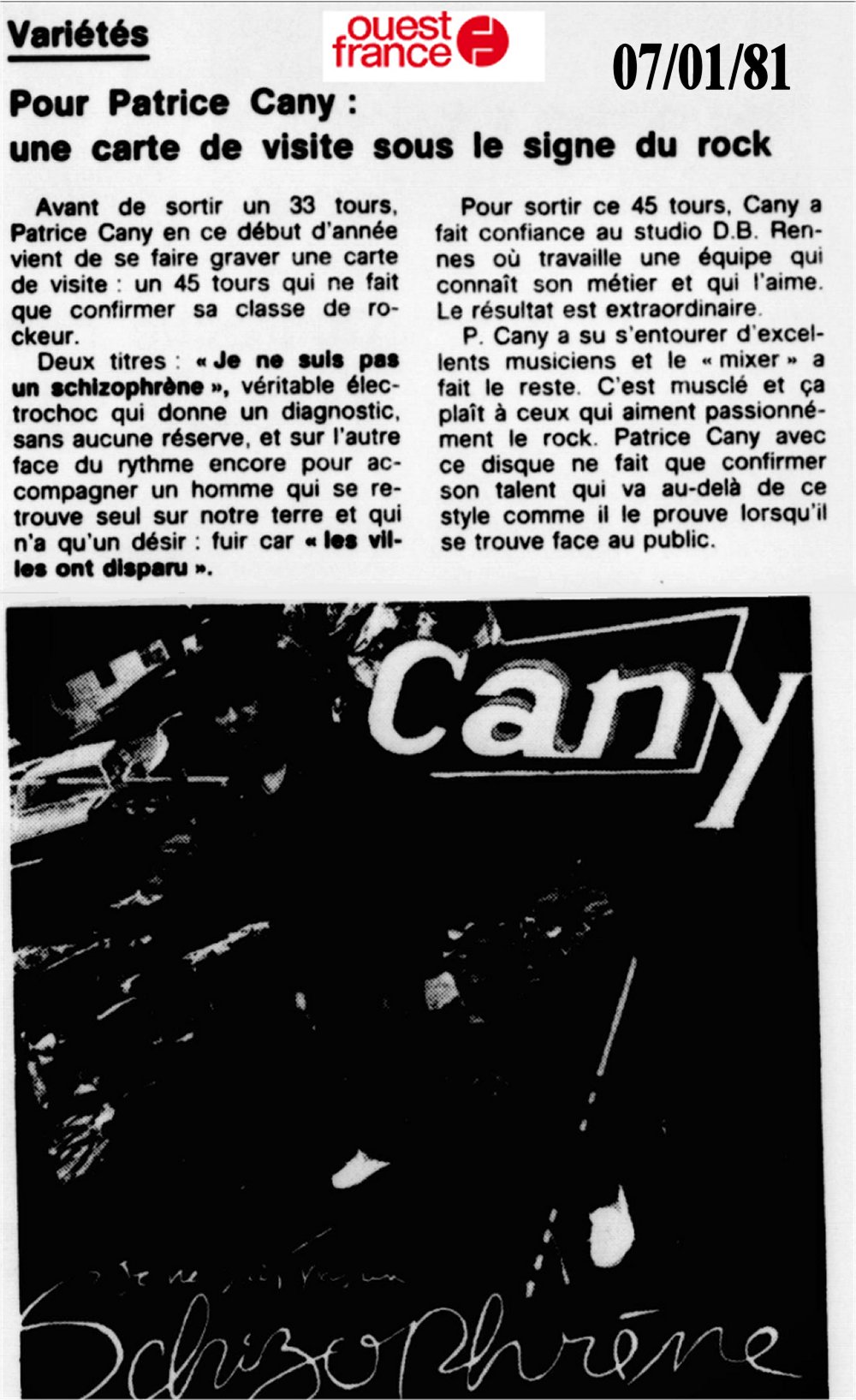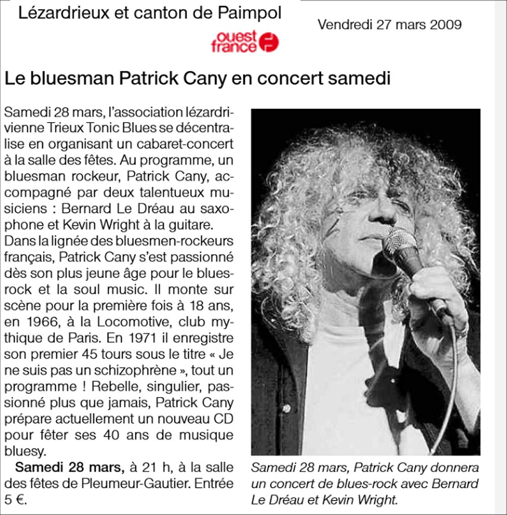 sur "Nuits bluesy" Patrick CANY: vocal, grosse caisse. Nobby CLARKE: saxes. Bernard LE DREAU: saxes, clarinette. Stéphane LAIDET: harmonica. Kevin WRIGHT: guitare. Paikey BUTLER: contrebasse. Patrick PERON: prise de son, mixage, orgue Hammond.